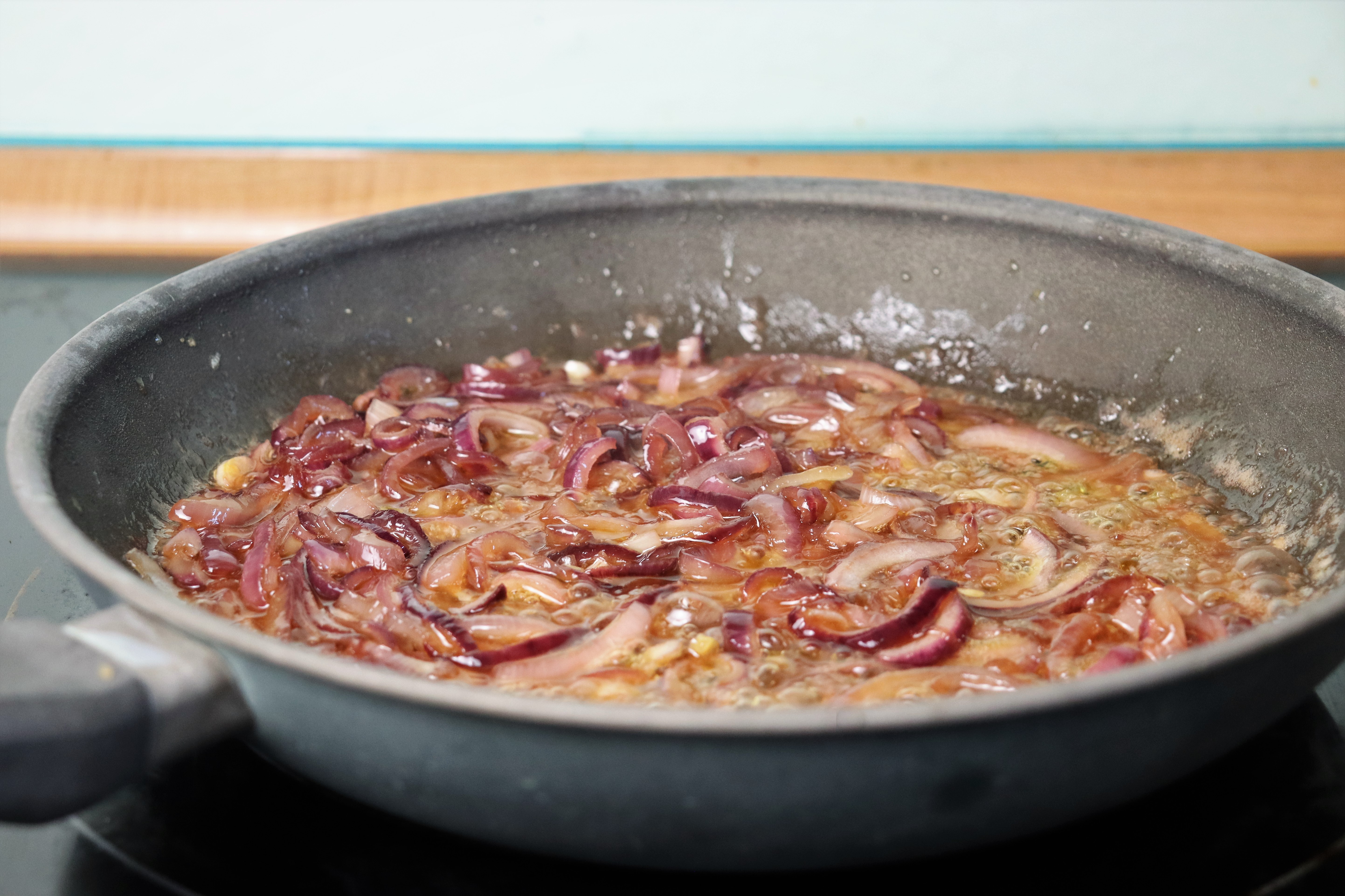 ...add the onions and simmer over medium heat for about 30 minutes until the onions are really golden brown and caramelized.